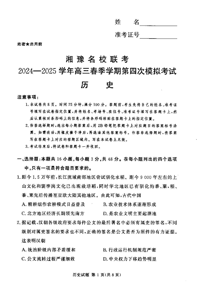 湘豫名校联考2025届高三下学期第四次模拟考试历史