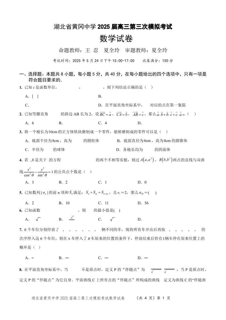 湖北省黄冈中学2025届高三第三次模拟考试数学