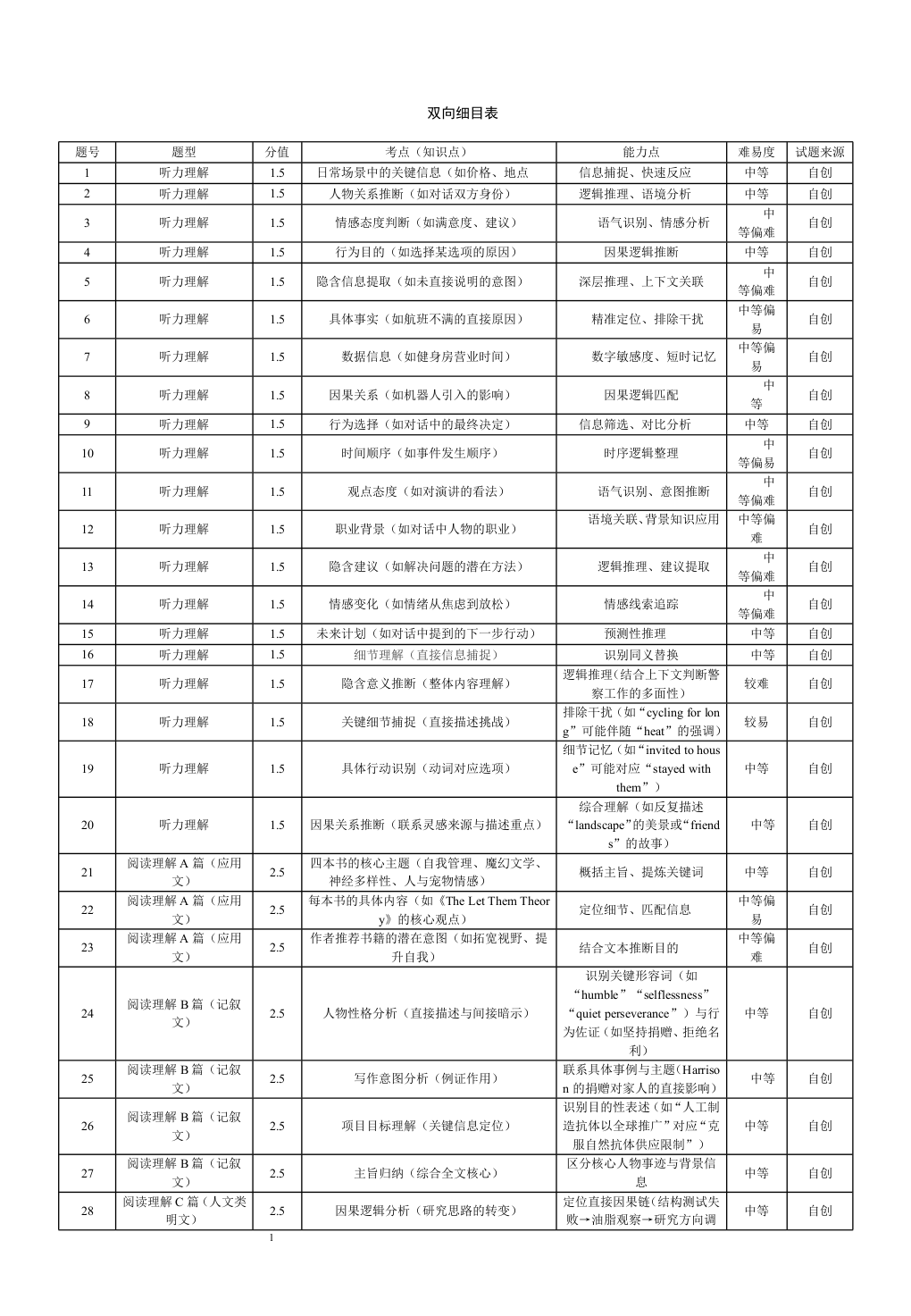 湖北省黄冈中学2025届高三第三次模拟考试英语双向细目表