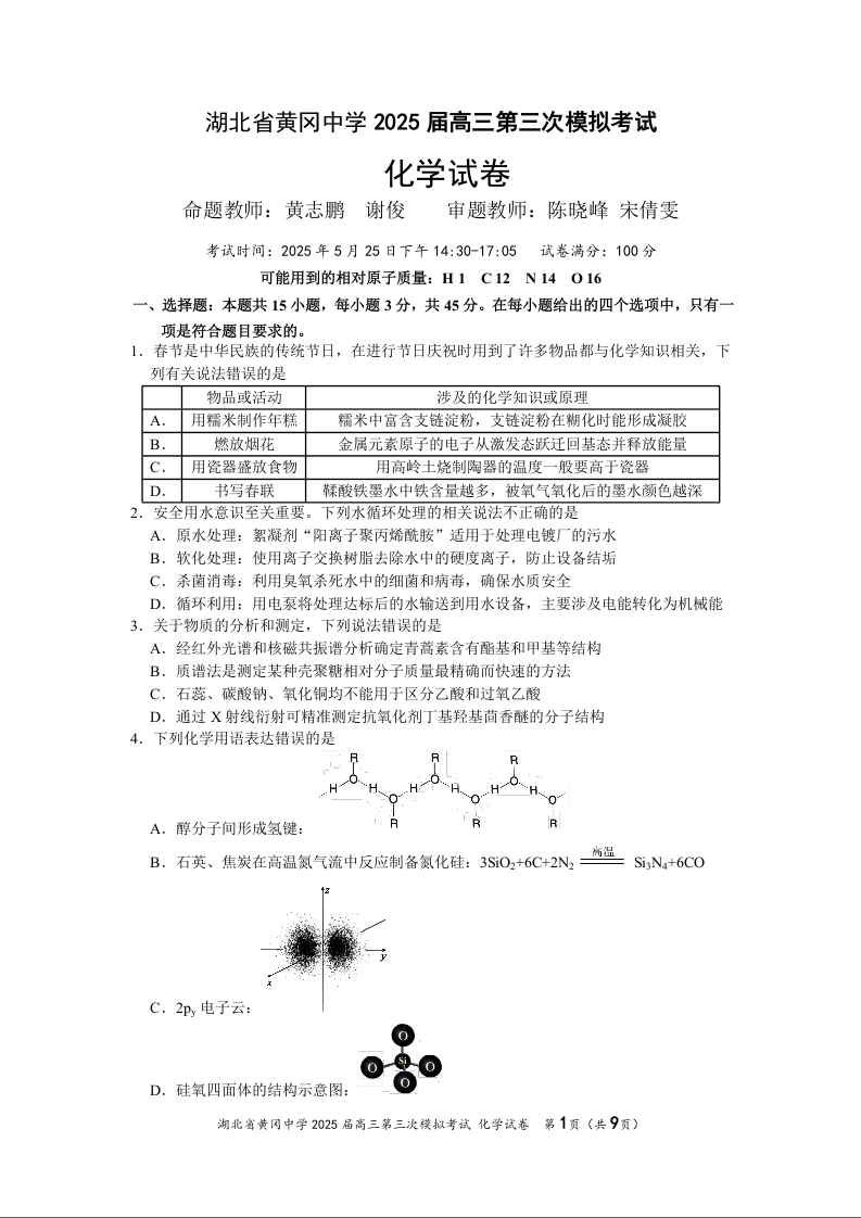 湖北省黄冈中学2025届高三第三次模拟考试化学