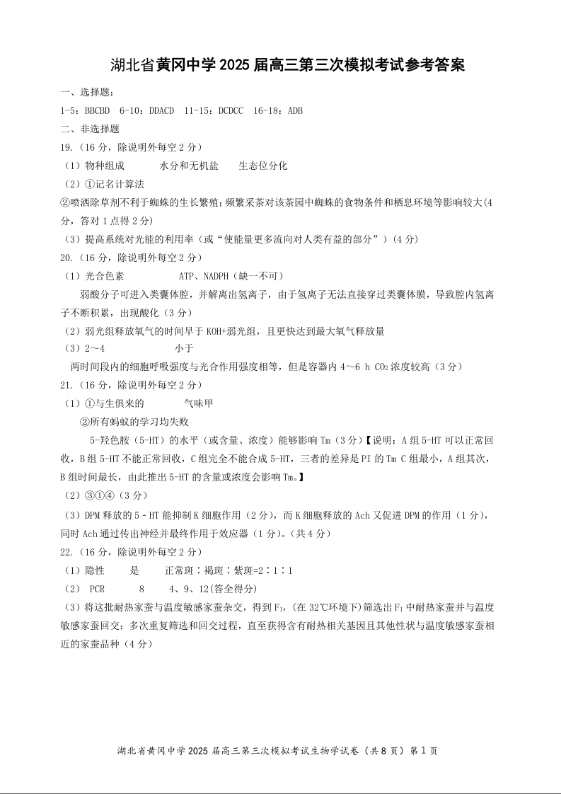 湖北省黄冈中学2025届高三第三次模拟考试生物答案