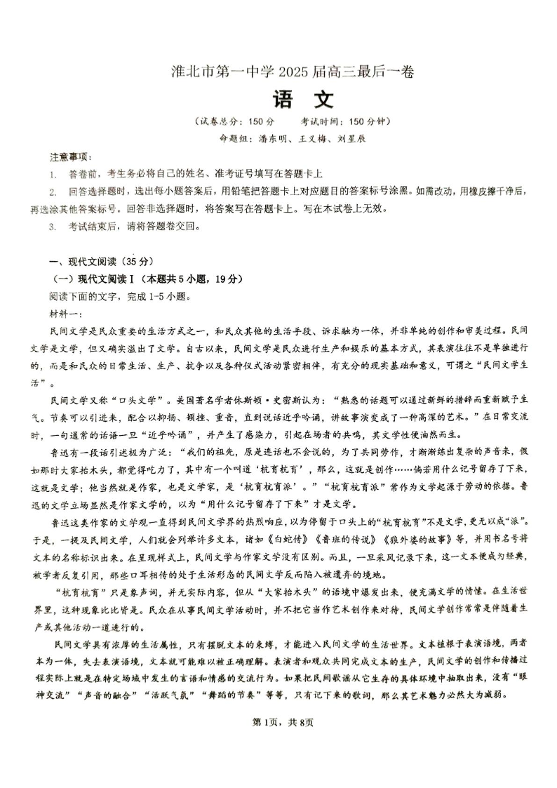 安徽省淮北市第一中学2025届高三下学期高考模拟预测语文
