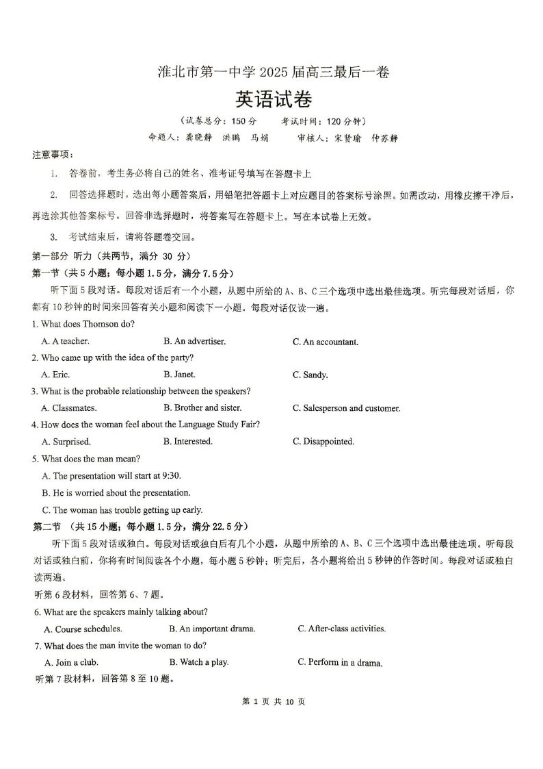 安徽省淮北市第一中学2025届高三下学期高考模拟预测英语