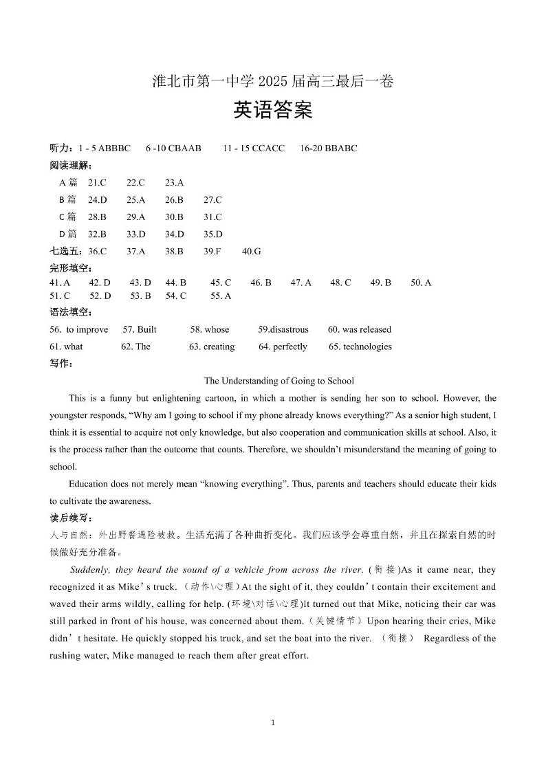 安徽省淮北市第一中学2025届高三下学期高考模拟预测英语答案