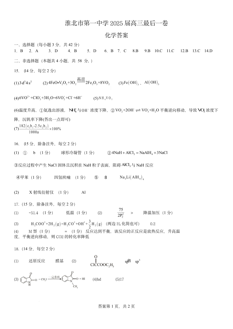 安徽省淮北市第一中学2025届高三下学期高考模拟预测化学答案