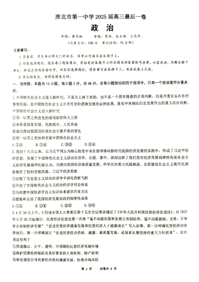 安徽省淮北市第一中学2025届高三下学期高考模拟预测政治