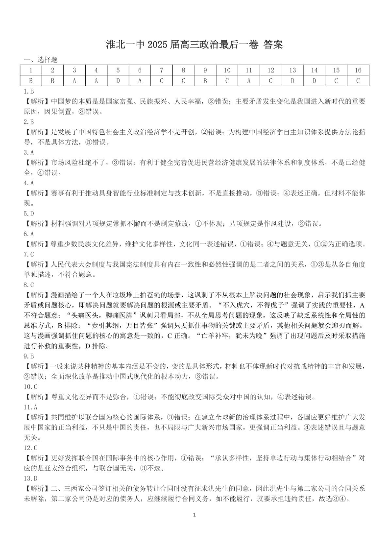 安徽省淮北市第一中学2025届高三下学期高考模拟预测政治答案