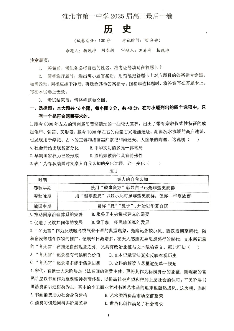 安徽省淮北市第一中学2025届高三下学期高考模拟预测历史