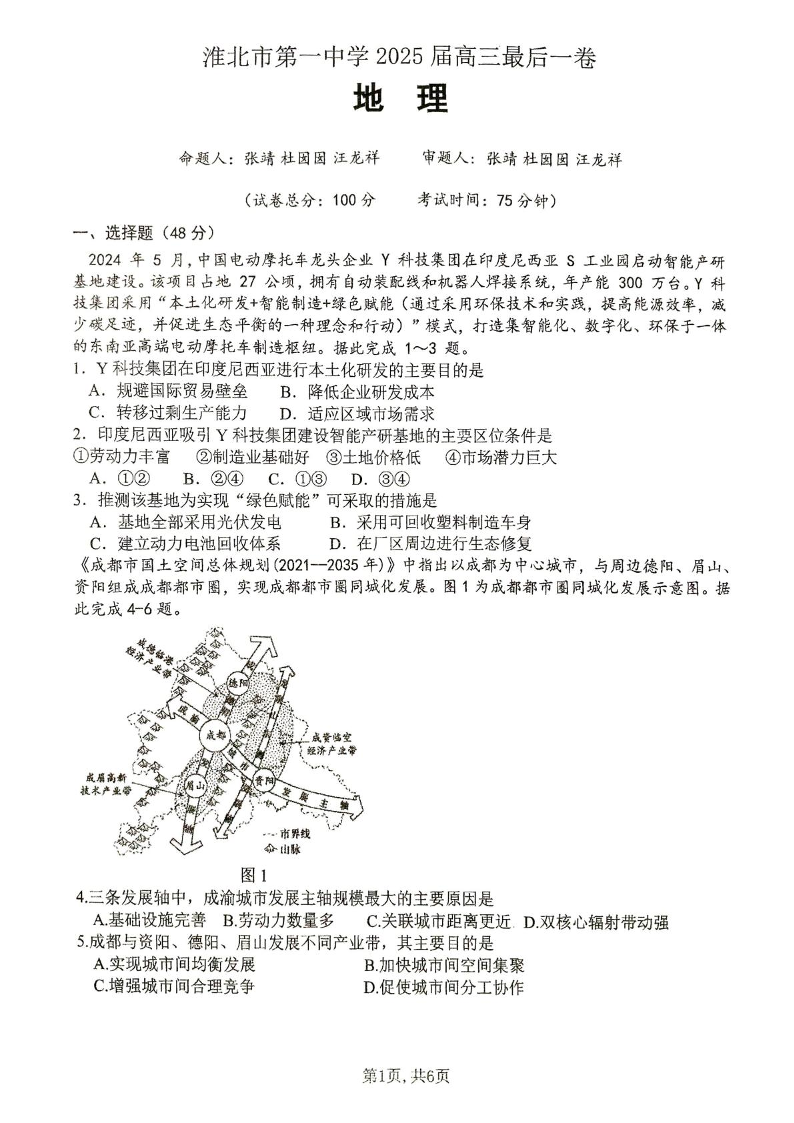 安徽省淮北市第一中学2025届高三下学期高考模拟预测地理
