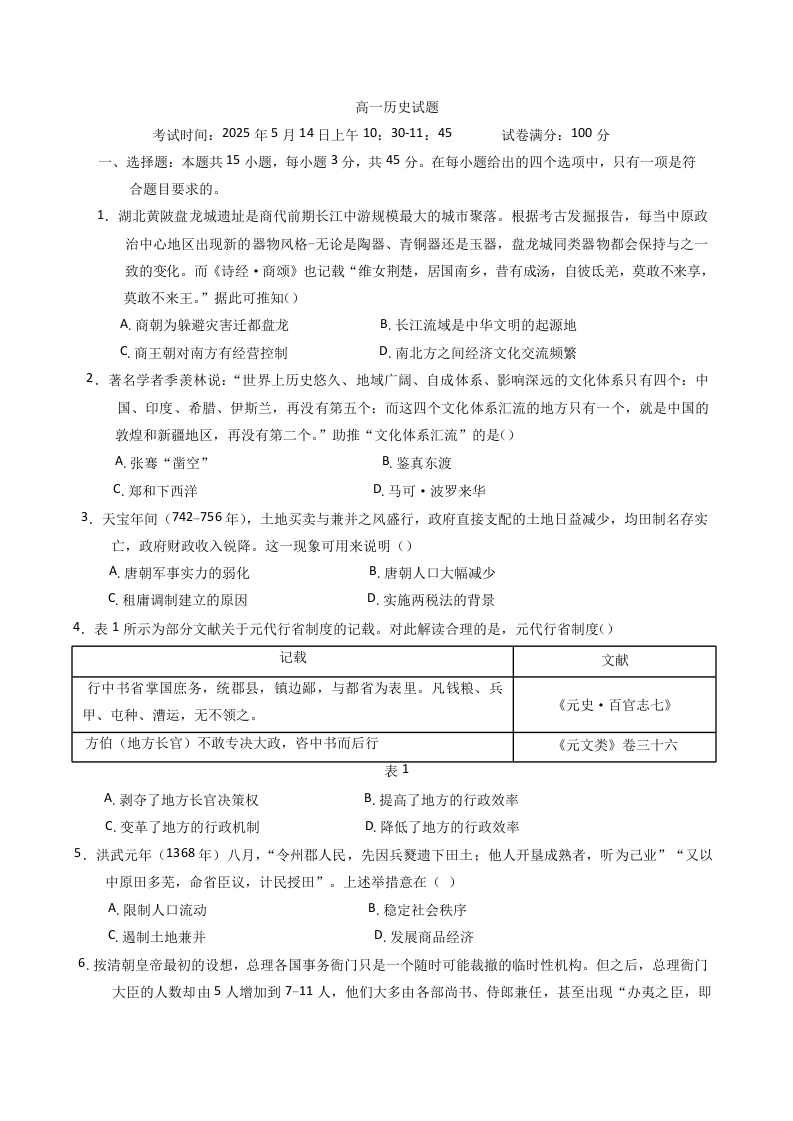 湖北省重点高中智学联盟2024-2025学年下学期5月高一联考历史+答案