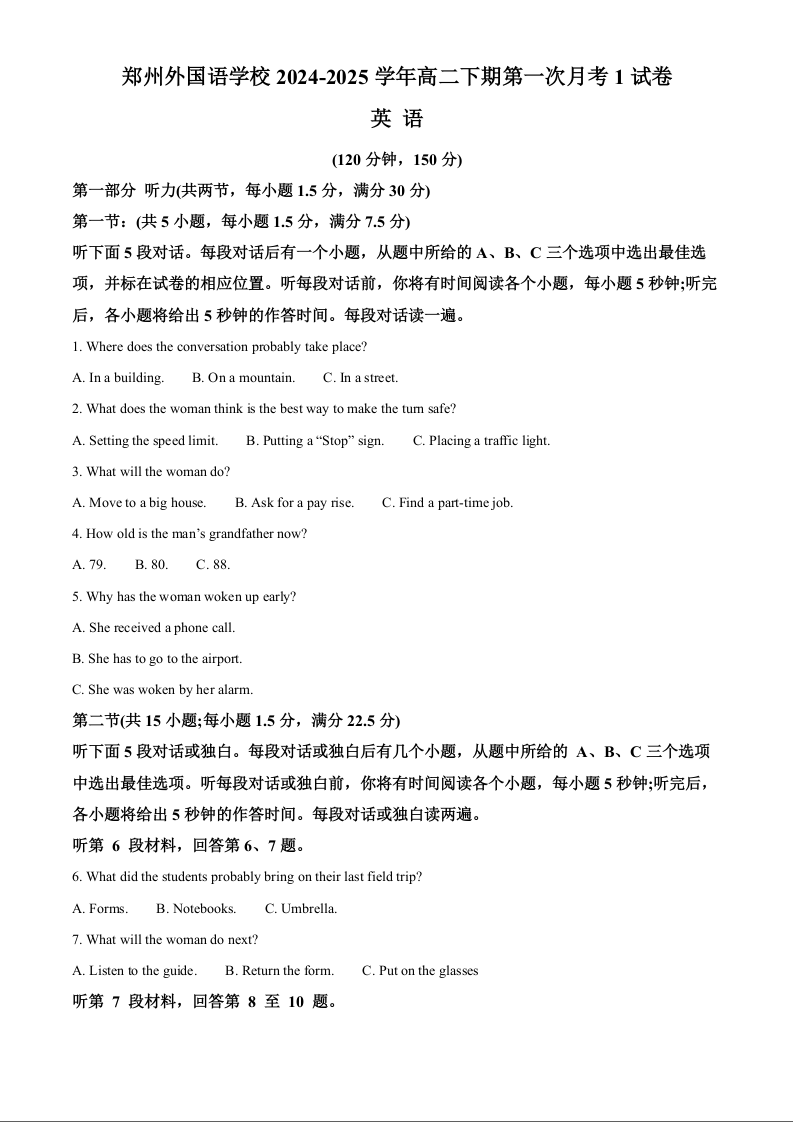 河南省郑州外国语学校2024-2025学年下学期高二月考1英语+答案