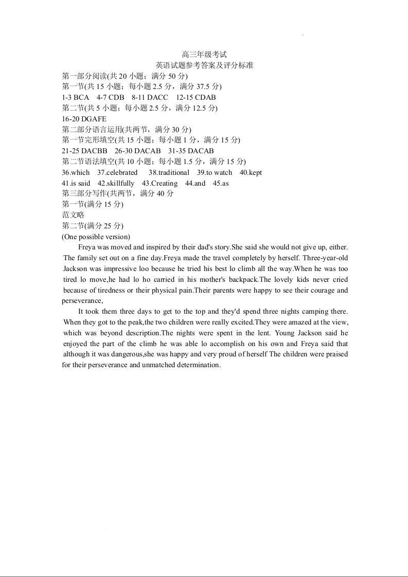 山东省泰安市2024届高三上学期期末考试英语答案