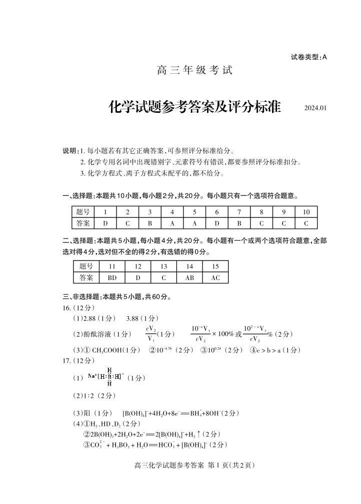 山东省泰安市2024届高三上学期期末考试化学答案