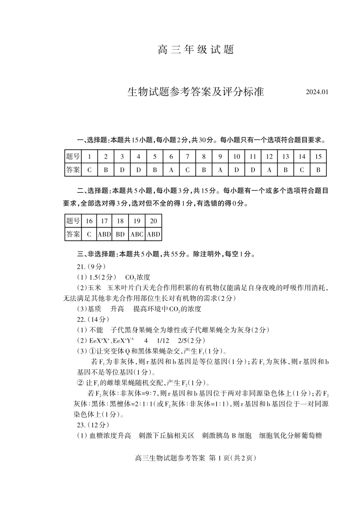 山东省泰安市2024届高三上学期期末考试生物答案