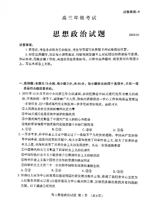 山东省泰安市2024届高三上学期期末考试政治
