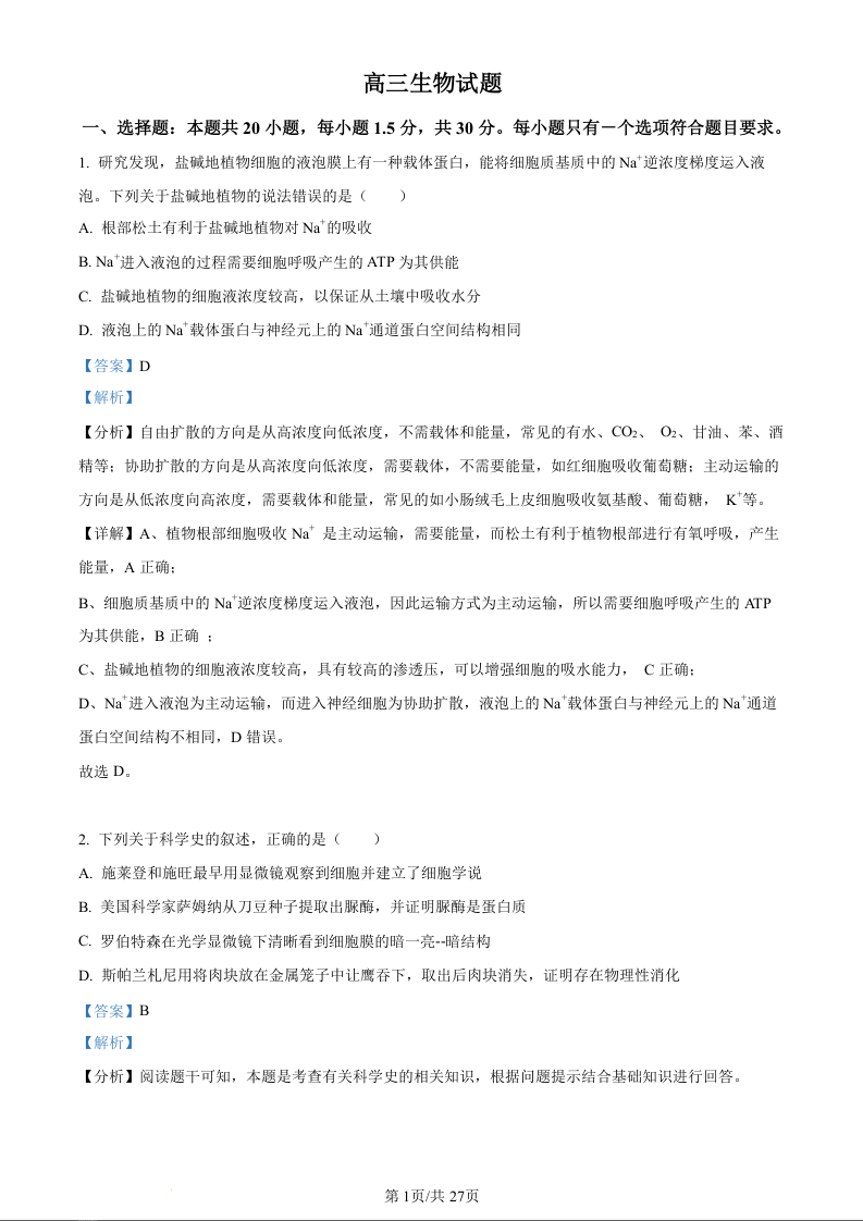 山东省潍坊市2024届昌乐一中学高三模拟预测生物(精品解析版)