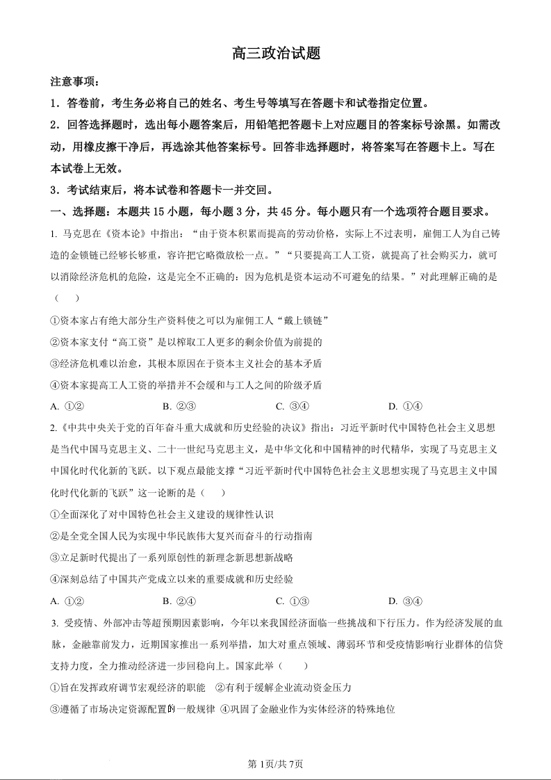 山东省潍坊市2024届昌乐一中学高三模拟预测政治(原卷版)