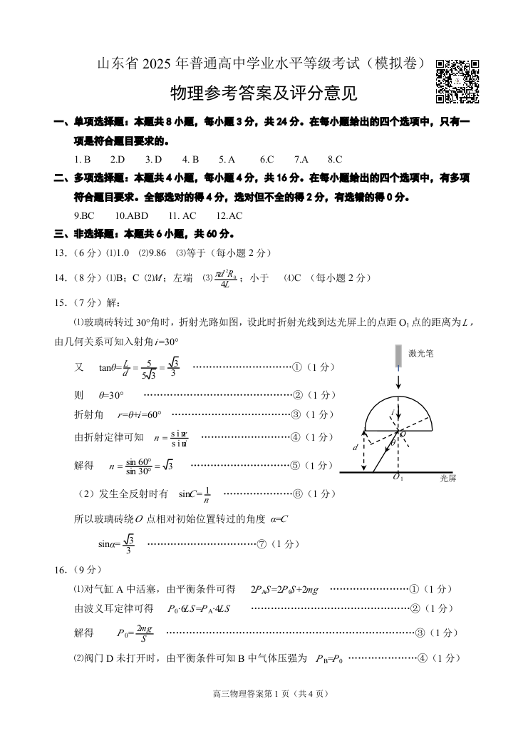 山东省烟台市2024-2025学年下学期5月高三三模考试物理答案