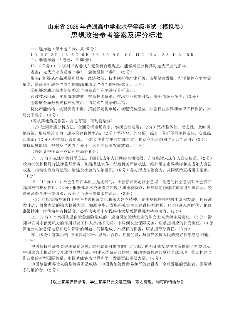 山东省烟台市2024-2025学年下学期5月高三三模考试政治答案