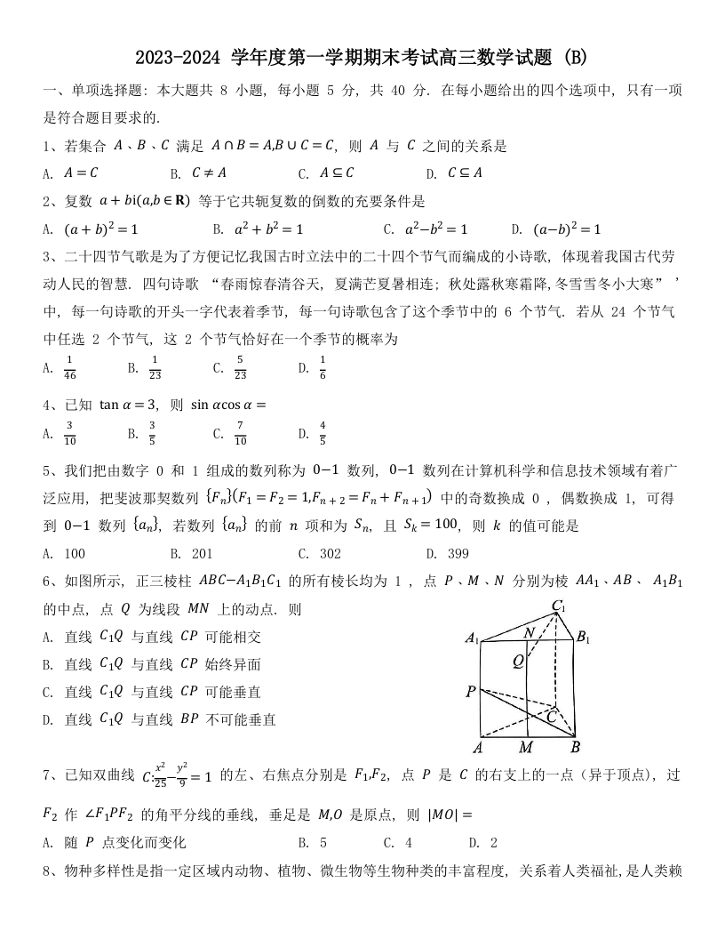 山东省烟台市、菏泽市2024届高三上学期1月期末考试数学