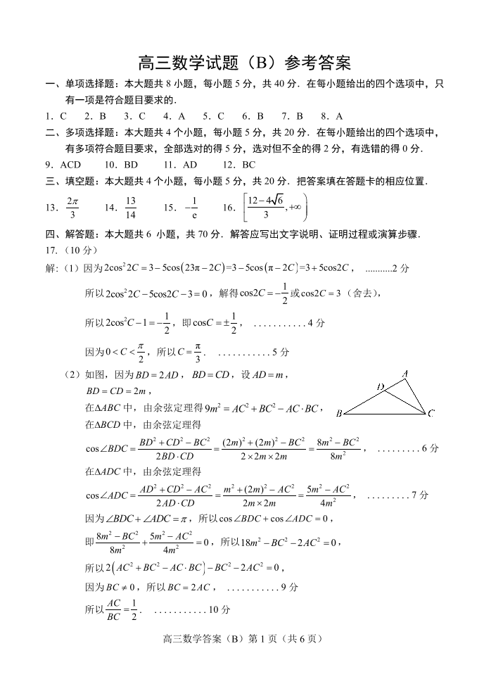 山东省烟台市、菏泽市2024届高三上学期1月期末考试数学答案