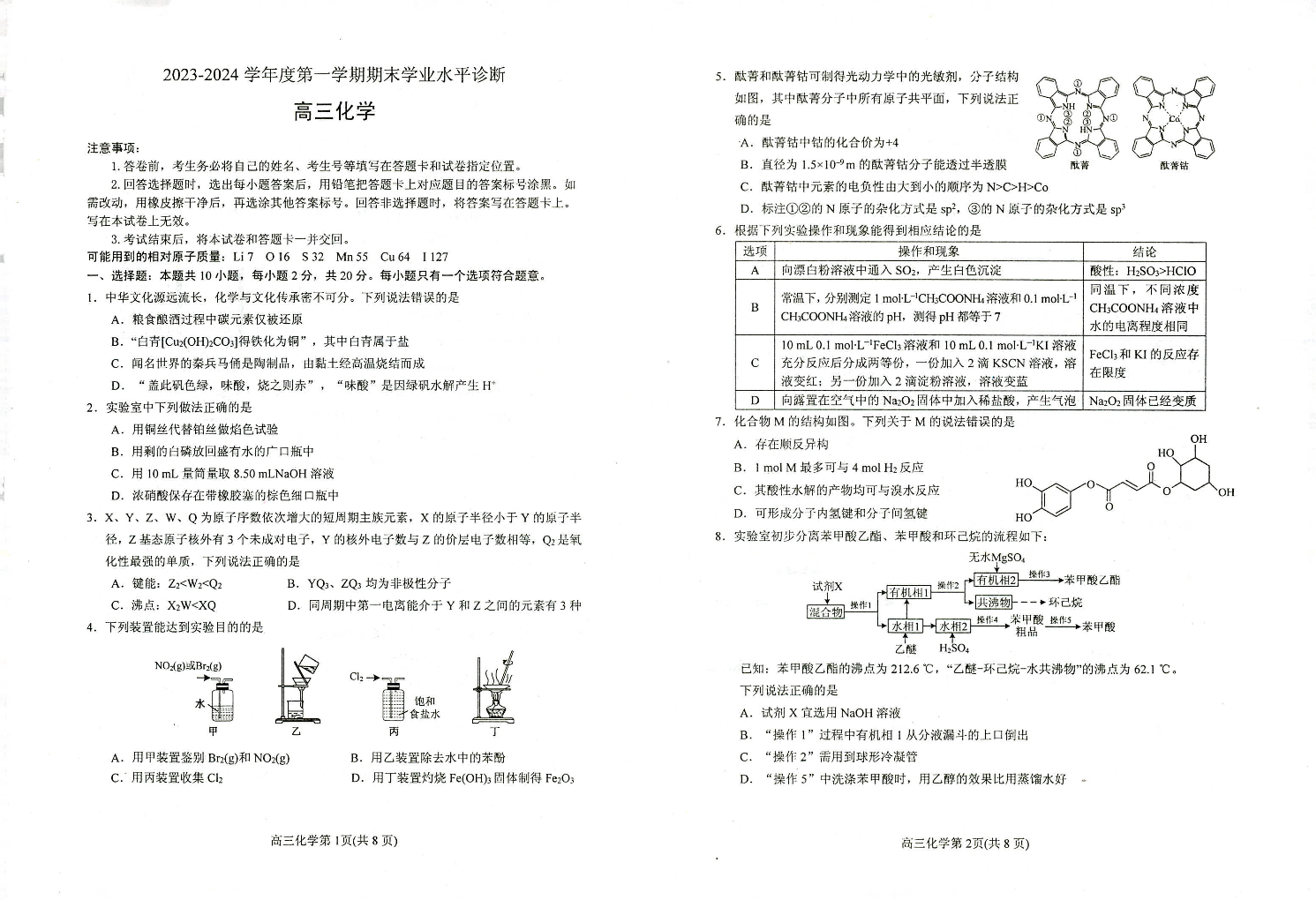 山东省烟台市、菏泽市2024届高三上学期1月期末考试化学