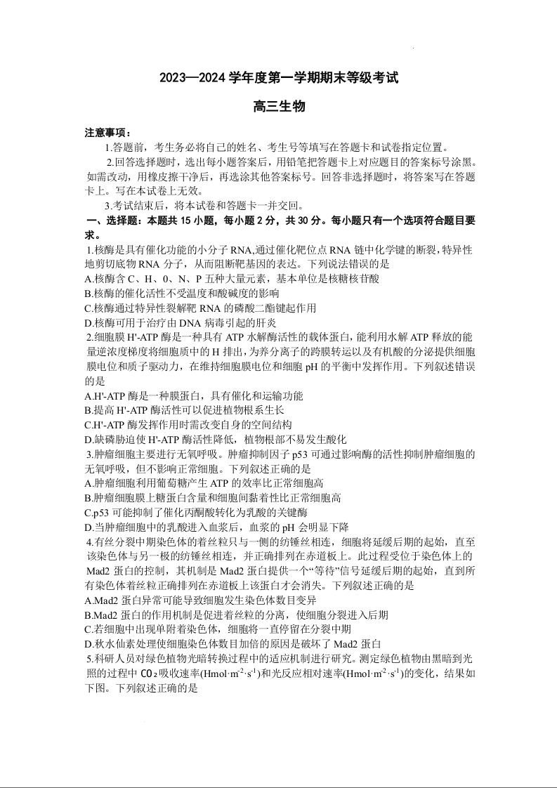 山东省烟台市、菏泽市2024届高三上学期1月期末考试生物+答案