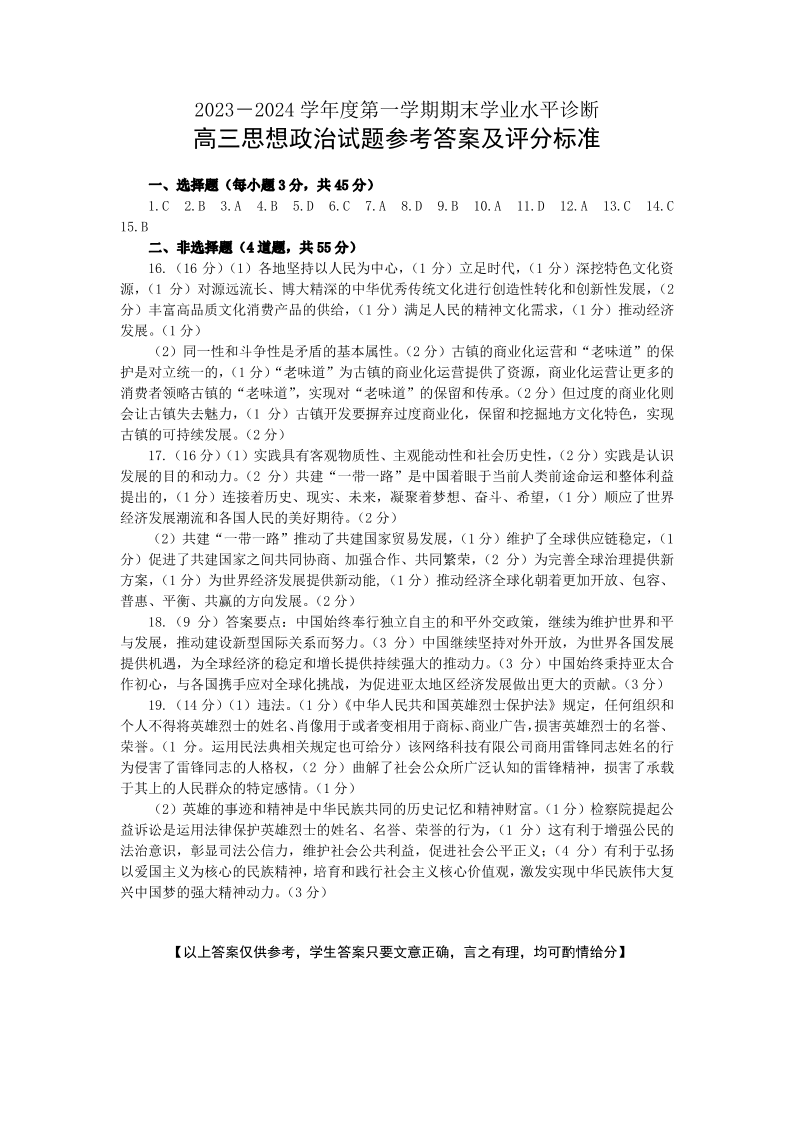 山东省烟台市、菏泽市2024届高三上学期1月期末考试政治答案