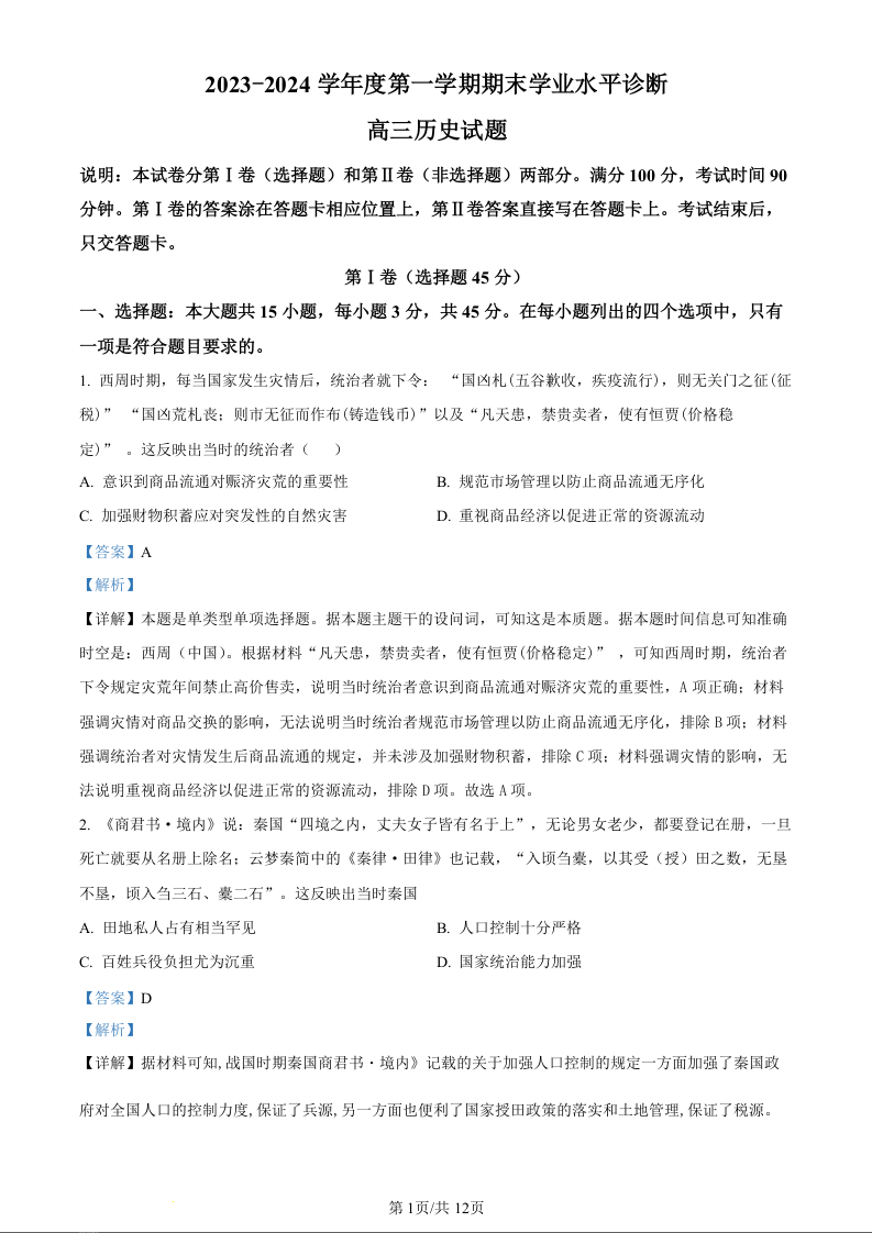 山东省烟台市、菏泽市2024届高三上学期1月期末考试历史(精品解析版)