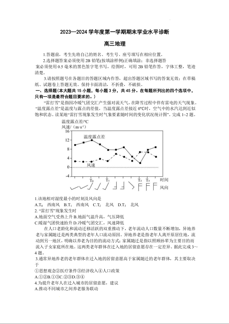 山东省烟台市、菏泽市2024届高三上学期1月期末考试地理+答案
