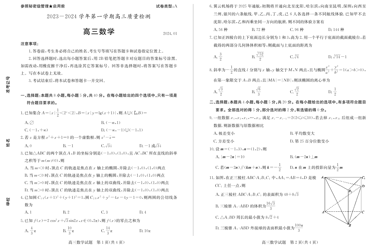 山东省枣庄市2024届高三上学期1月期末质量检测数学+答案