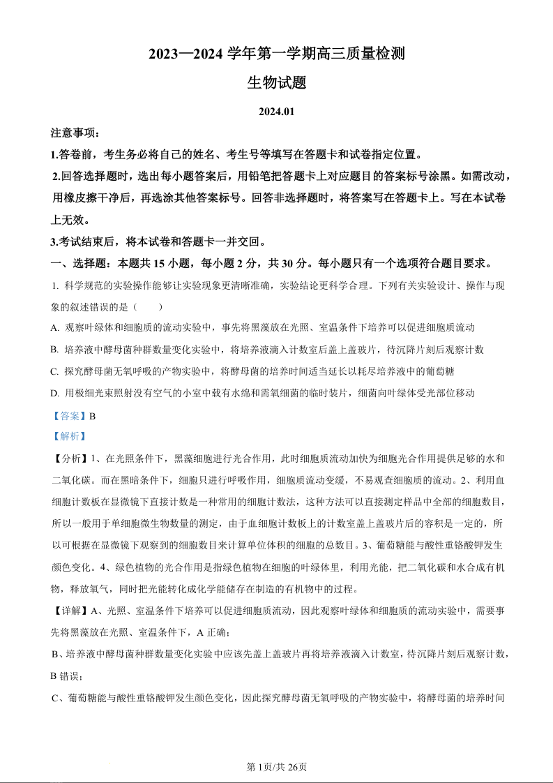 山东省枣庄市2024届高三上学期1月期末质量检测生物(精品解析版)
