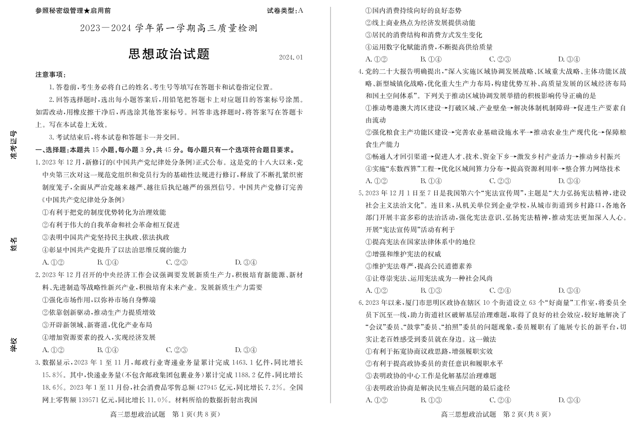 山东省枣庄市2024届高三上学期1月期末质量检测政治