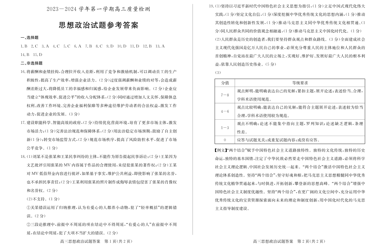 山东省枣庄市2024届高三上学期1月期末质量检测政治答案