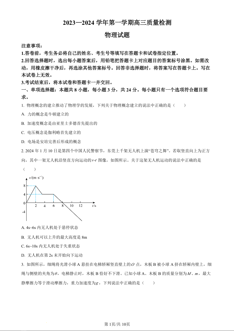 山东省枣庄市2024届高三上学期期末考试试题物理(原卷版)