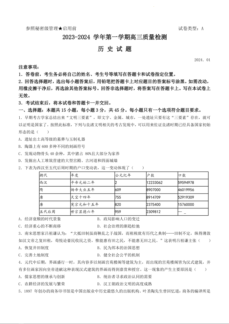 山东省枣庄市2024届高三上学期期末考试试题历史+答案