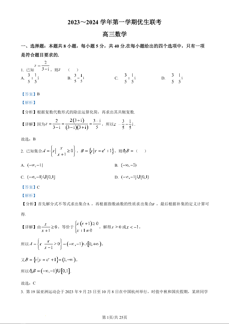 山西省2023-2024学年高三上学期期末优生联考数学(精品解析版)