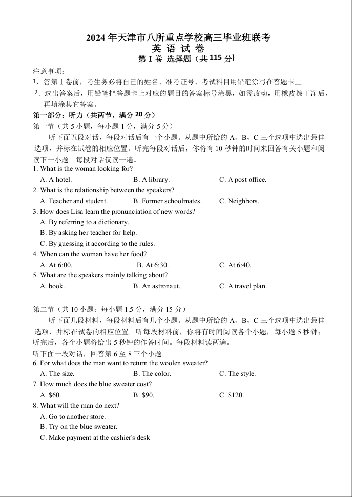 天津市八所重点学校2024届高三上学期期末联考英语+答案