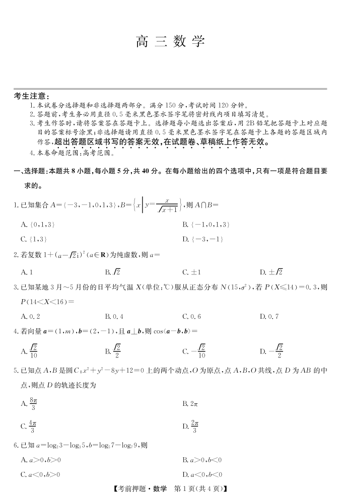 安徽省区域高中盟2025届下学期5月高三考前押题数学