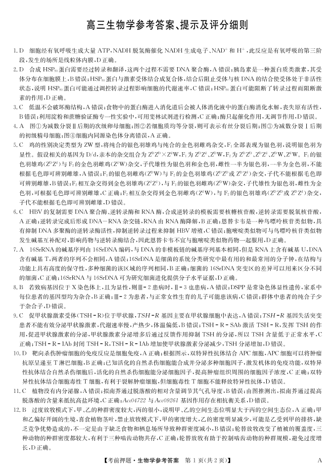 安徽省区域高中盟2025届下学期5月高三考前押题生物答案