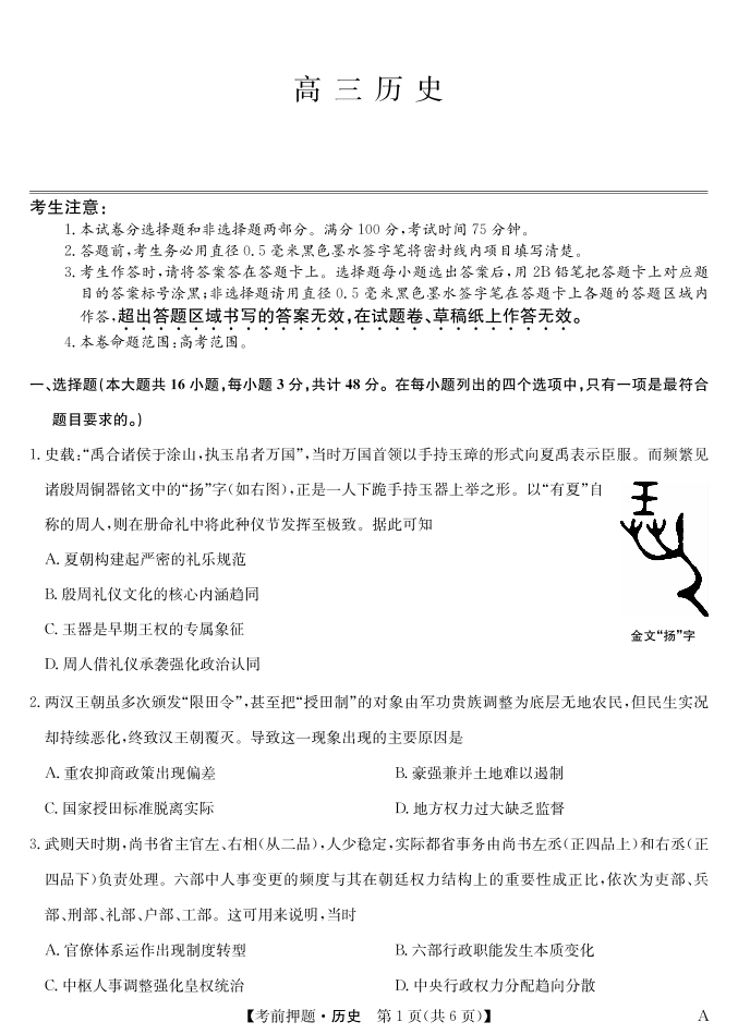 安徽省区域高中盟2025届下学期5月高三考前押题历史