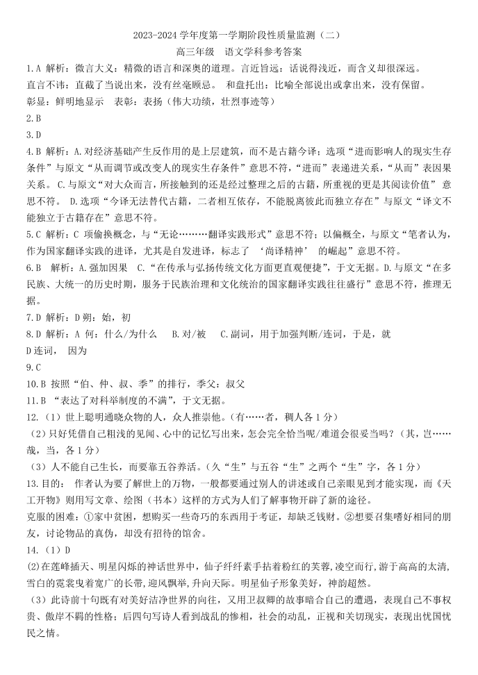 天津市南开区2024届高三上学期质量检测(二)语文答案