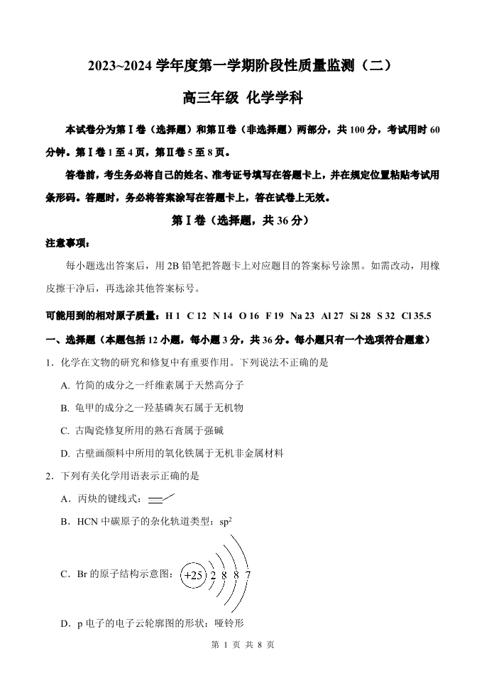 天津市南开区2024届高三上学期质量检测(二)化学
