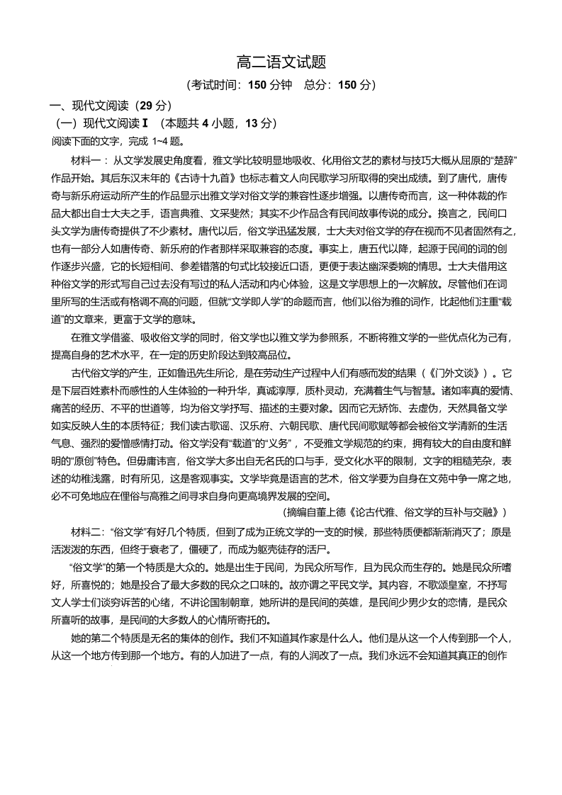 福建省龙岩市一级校联盟2024-2025学年下学期4月高二期中考试语文+答案