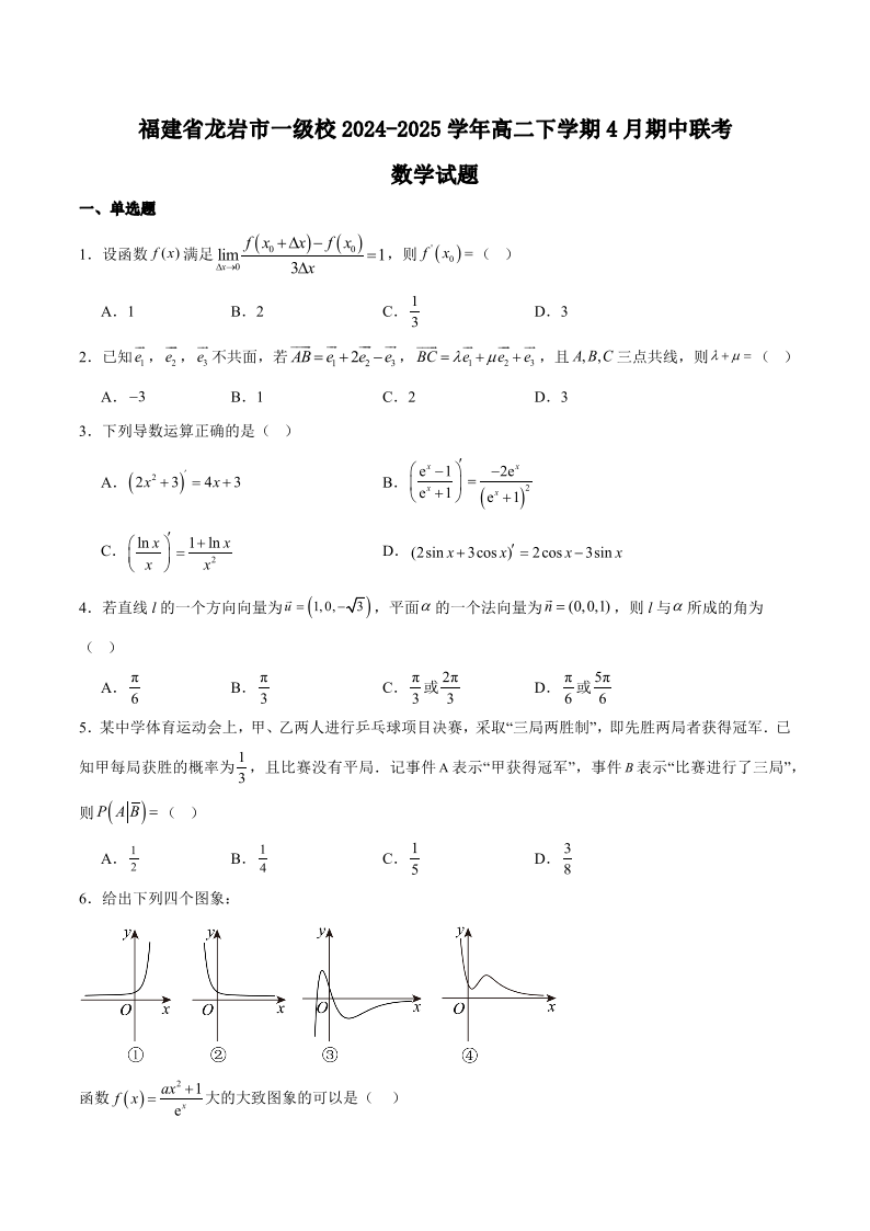 福建省龙岩市一级校联盟2024-2025学年下学期4月高二期中考试数学+答案