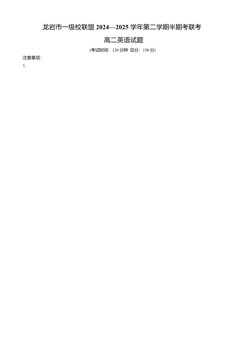 福建省龙岩市一级校联盟2024-2025学年下学期4月高二期中考试英语+答案