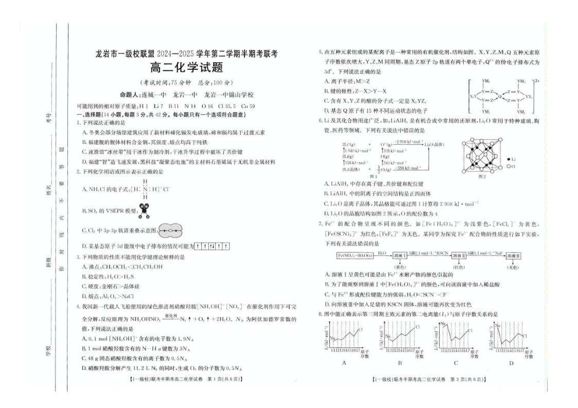 福建省龙岩市一级校联盟2024-2025学年下学期4月高二期中考试化学+答案