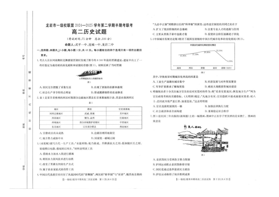 福建省龙岩市一级校联盟2024-2025学年下学期4月高二期中考试历史+答案