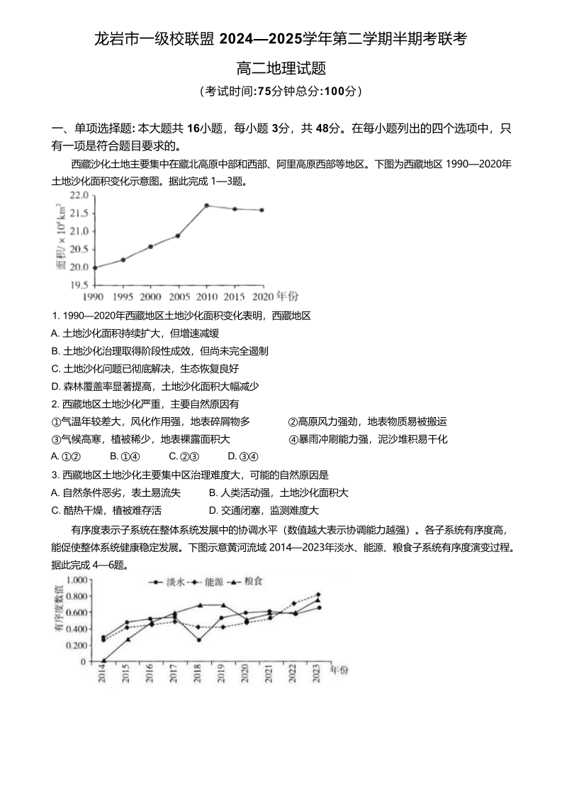 福建省龙岩市一级校联盟2024-2025学年下学期4月高二期中考试地理+答案