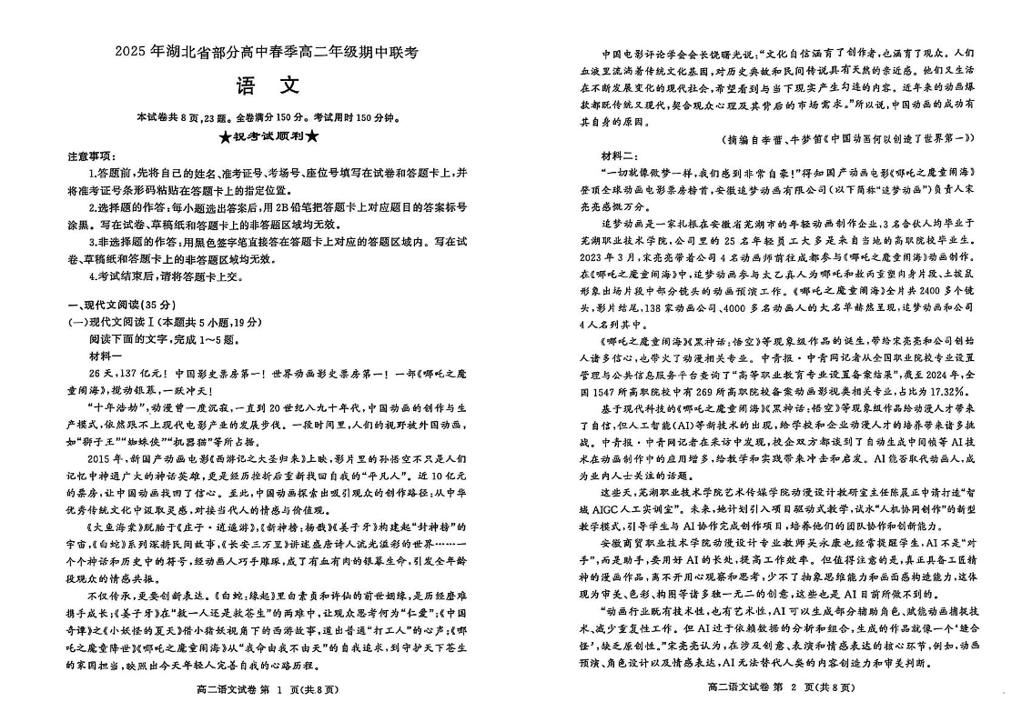 湖北省黄冈市十五校2024-2025学年下学期4月高二期中联考语文+答案